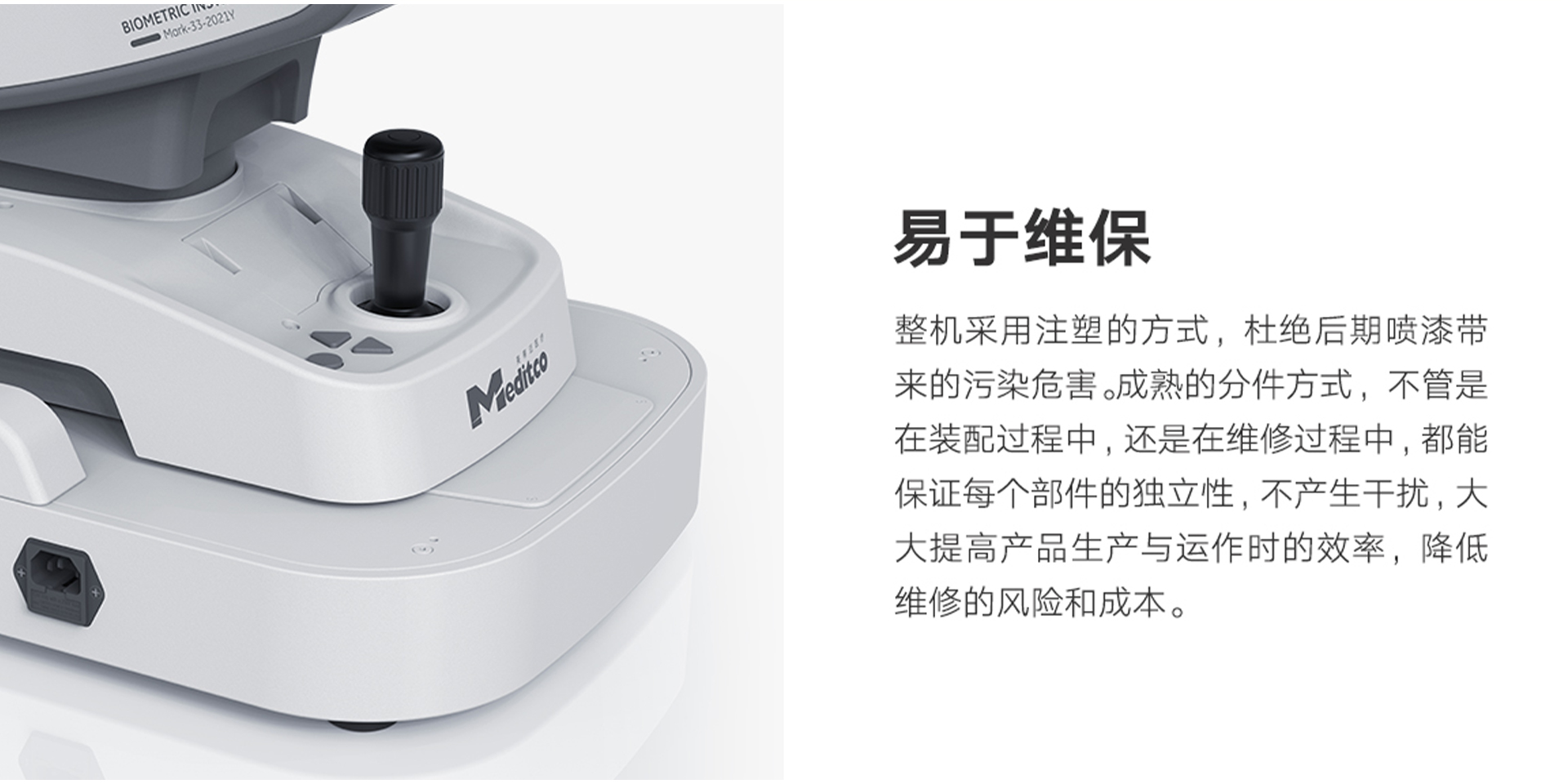 通過重新規(guī)整美蒂邁品牌的設計語義,采用C型包裹式的家族化語言,將整個產品系列統(tǒng)一。將冗雜的結構件都包裹在內,整體的操作模式將變得更加高效與直接。用戶得到的反饋也將更將的清晰與明朗。目鏡處標志性的藍色圓環(huán),代表著美蒂邁家族的品牌形象和視覺識別點。圓角與弧面的組合,弱化醫(yī)療產品給患者帶來的壓迫感和緊張感,增強親和力。整機采用注塑的方式,杜絕后期噴漆帶來的污染危害。成熟的分件方式,不管是在裝配過程中,還是在維修過程中,都能保證每個部件的獨立性,不產生干擾,大大提高產品生產與運作時的效率,降低維修的風險和成本。