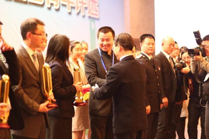 丁偉從全國政協(xié)常委、上海市政協(xié)副主席周漢民領導手中接過這意義深刻的獎杯