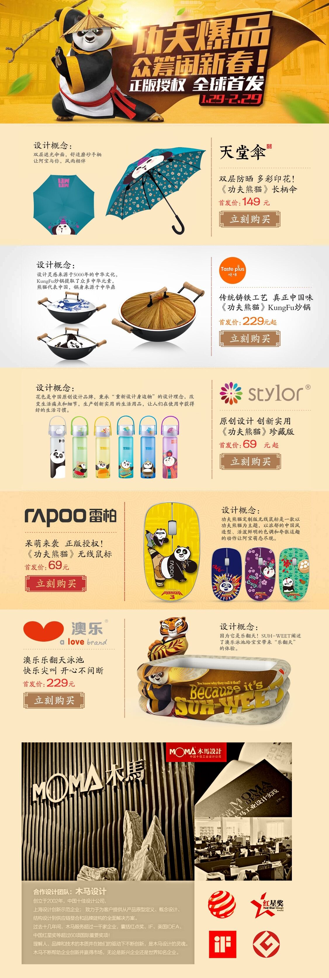 1月29日共上線20款木馬設(shè)計作品,其中包括花色優(yōu)品玻璃感溫杯、悅味珍藏版Kung Fu32CM炒鍋、雷柏功夫熊貓定制版無線鼠標(biāo)、功夫熊貓系列兒童泳池、天堂傘之功夫熊貓折疊傘。創(chuàng)意產(chǎn)品件件精彩。