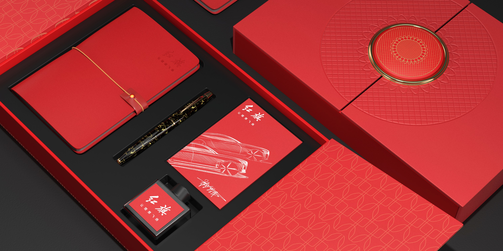 該設(shè)計靈感來自于紅旗H9車型的側(cè)面腰線,并且在材質(zhì)上采用L5車型的大漆工藝,制作具有紀念價值意義的高端鋼筆,禮盒中配有高端墨瓶和牛皮真皮記事本并留有董事長親簽紀念賀卡。大漆工藝的不穩(wěn)定性和獨特性,成為了鋼筆的亮點,配上車型的外輪廓曲線,以及紅旗標志性的紅線作為特征,形成了產(chǎn)品的差異化。設(shè)計師把大漆紋理變成一種矢量圖案,并計算出無縫的連續(xù)性花紋,可以應(yīng)用在此系列的各個產(chǎn)品中,作為標志性的肌理,具有統(tǒng)一性。