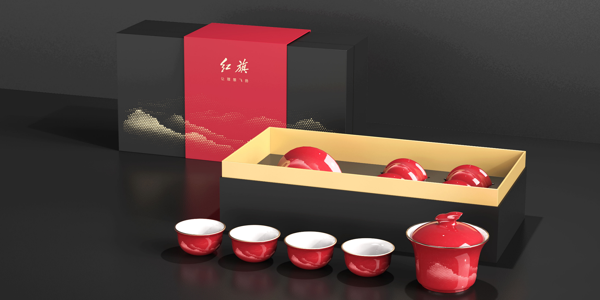 該茶具套裝,專為H9+的超高端用戶定制設(shè)計(jì)。殷殷如初的紅旗紅釉色,與千里江山的相遇,仿佛描繪了一幅日出東方、朝日飽滿的景象。日用之美,在于器物之美,色澤純正,嬌而不艷,瑩潤(rùn)蘊(yùn)藉,釉色勻一,山水剪影,若影若現(xiàn),透露出心懷天下之感,自帶光芒。杯體側(cè)面曲線與現(xiàn)代紅旗車型標(biāo)志前臉曲線吻合,溫故而立新。手作之美,杯口圓潤(rùn),手感細(xì)膩,內(nèi)釉青綠,優(yōu)雅美觀,底部光滑,平穩(wěn)放置。表面紅釉,主要以銅元素位著色劑,經(jīng)過高溫還原,一次燒制而成,并且色澤融入中國(guó)特有的宮廷氣質(zhì)。朱紅的美延續(xù)數(shù)年,變幻無窮??晒诺洹⒖蓵r(shí)尚,展現(xiàn)出別具一格的高級(jí)美。山水圖案用點(diǎn)陣的手法表現(xiàn),既有古樸的意境,又具有現(xiàn)代感,體現(xiàn)出了一種新中式的情感。