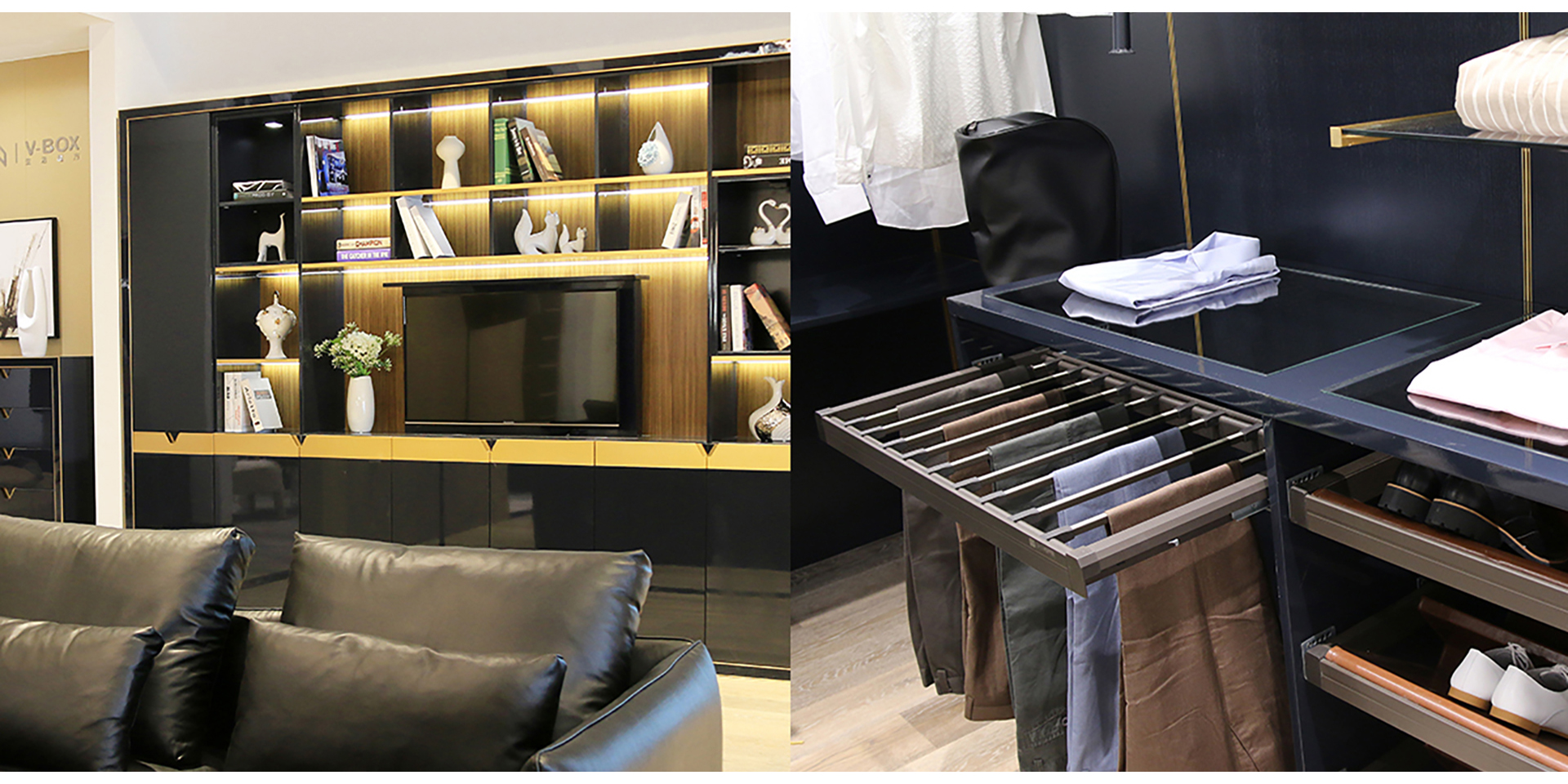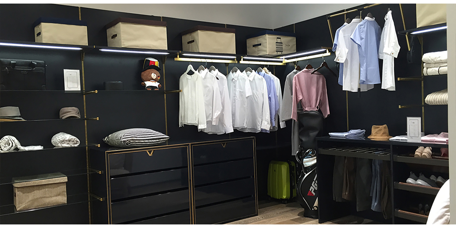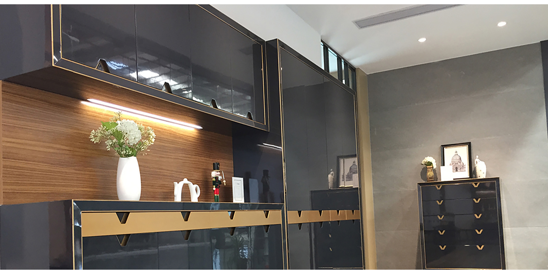 家具設(shè)計(jì)重要的,一是體現(xiàn)空間藝術(shù),二是實(shí)現(xiàn)家居的系統(tǒng)化。所以你會(huì)發(fā)現(xiàn)我們?yōu)榉屏指駹査O(shè)計(jì)的產(chǎn)品,從進(jìn)門開始,鞋柜、酒柜、餐邊柜、書柜、茶幾、電視柜以及櫥柜、衣柜都有,這就是我們?cè)谙到y(tǒng)化家居在空間一體化上給人的功能性和感官上的享受。我們?yōu)槠浯蛟斓娜赂叨思揖呃闷放谱陨鞮OGO元素作為把手及細(xì)節(jié)造型的設(shè)計(jì)元素,形成自己企業(yè)的形象特征。此外,通過銅色嵌條烤漆的材料搭配營造尊貴體驗(yàn),也利用其質(zhì)感對(duì)比,給人更強(qiáng)設(shè)計(jì)感。玄關(guān)衣帽間可以根據(jù)陳列物的主人類型配有不同LED背光色彩,以帶給用戶更佳的體驗(yàn)感。利用我們的長處不僅把家居產(chǎn)品融為一體,更重要的是讓其成為了一個(gè)系列,讓用戶的家更加漂亮,也更具品位。