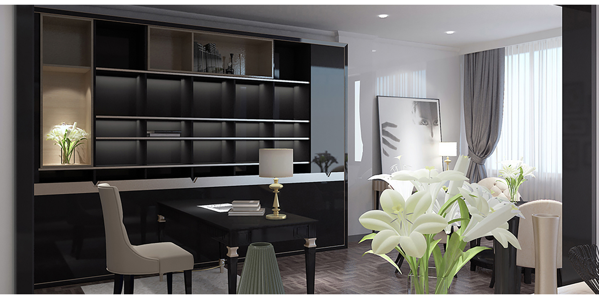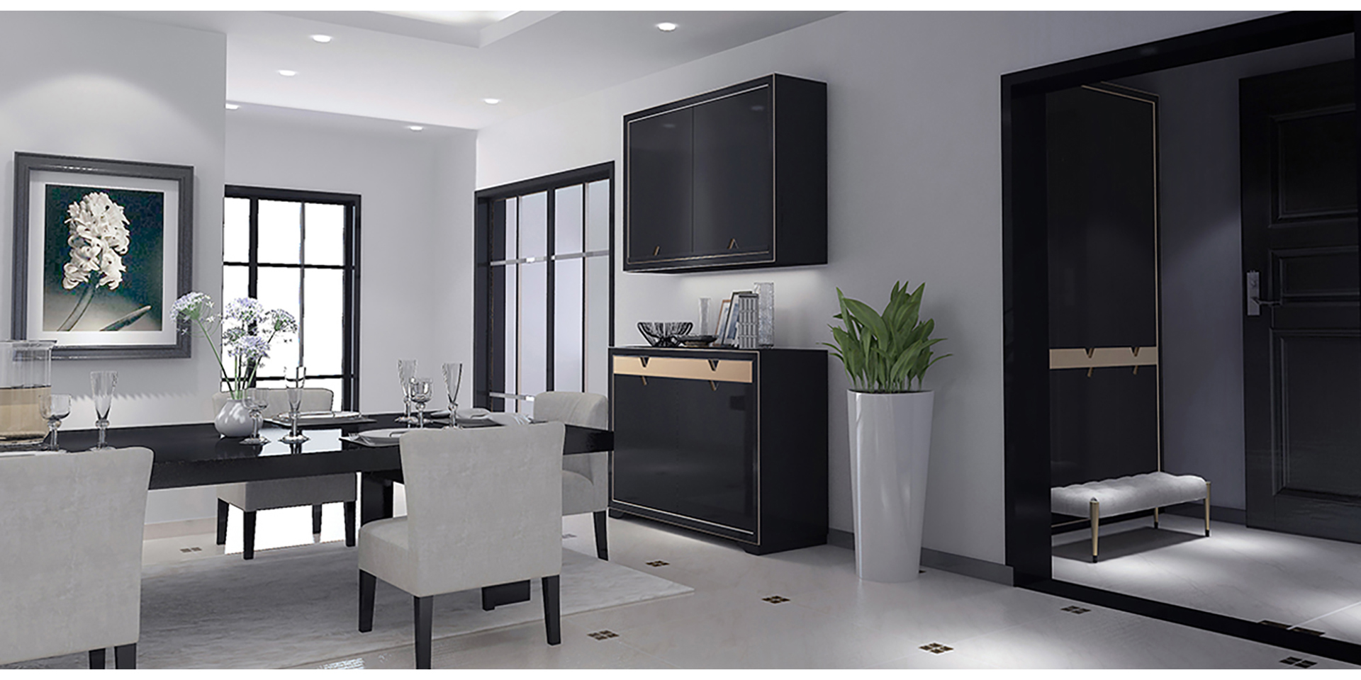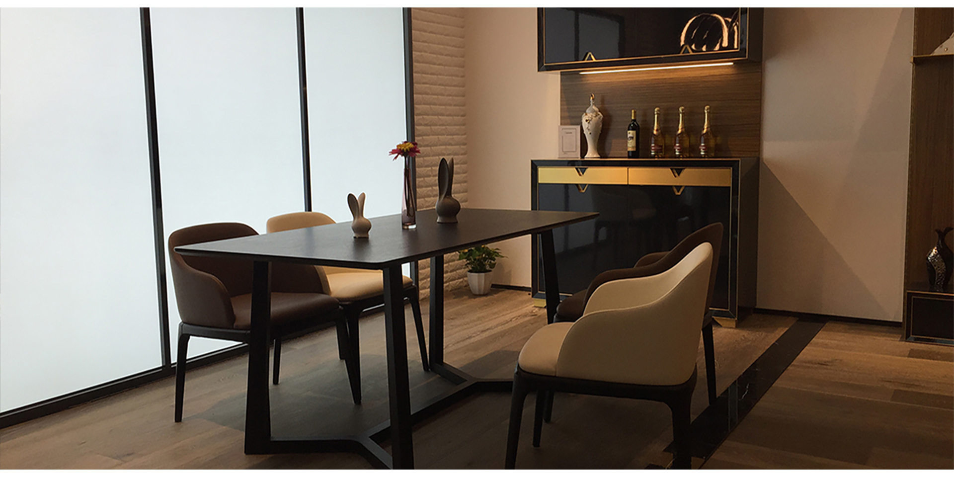 家具設(shè)計(jì)重要的,一是體現(xiàn)空間藝術(shù),二是實(shí)現(xiàn)家居的系統(tǒng)化。所以你會(huì)發(fā)現(xiàn)我們?yōu)榉屏指駹査O(shè)計(jì)的產(chǎn)品,從進(jìn)門開始,鞋柜、酒柜、餐邊柜、書柜、茶幾、電視柜以及櫥柜、衣柜都有,這就是我們?cè)谙到y(tǒng)化家居在空間一體化上給人的功能性和感官上的享受。我們?yōu)槠浯蛟斓娜赂叨思揖呃闷放谱陨鞮OGO元素作為把手及細(xì)節(jié)造型的設(shè)計(jì)元素,形成自己企業(yè)的形象特征。此外,通過銅色嵌條烤漆的材料搭配營造尊貴體驗(yàn),也利用其質(zhì)感對(duì)比,給人更強(qiáng)設(shè)計(jì)感。玄關(guān)衣帽間可以根據(jù)陳列物的主人類型配有不同LED背光色彩,以帶給用戶更佳的體驗(yàn)感。利用我們的長處不僅把家居產(chǎn)品融為一體,更重要的是讓其成為了一個(gè)系列,讓用戶的家更加漂亮,也更具品位。