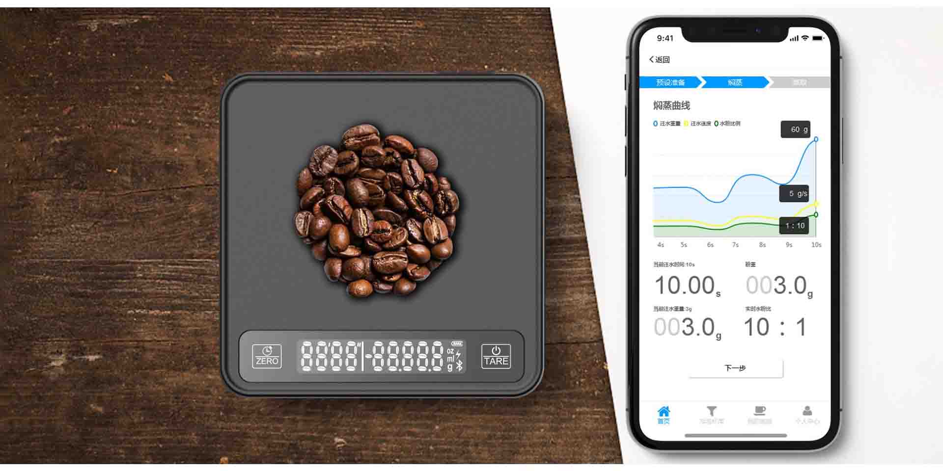 該產(chǎn)品通過藍(lán)牙連接手機(jī)App,由手機(jī)觀察記錄咖啡沖泡情況,掌控時(shí)間或是記錄你喜愛的咖啡水豆比例的智能咖啡秤,并且可以通過App生成配方圖片一鍵分享至社交軟件,與朋友分享交流手沖咖啡的樂趣。外型設(shè)計(jì)有著簡(jiǎn)約的現(xiàn)代感,一體成型,細(xì)節(jié)精致,與手沖咖啡的烹調(diào)場(chǎng)景相融合,十分專業(yè)利落。顯示時(shí)間與克重分區(qū),一目了然。