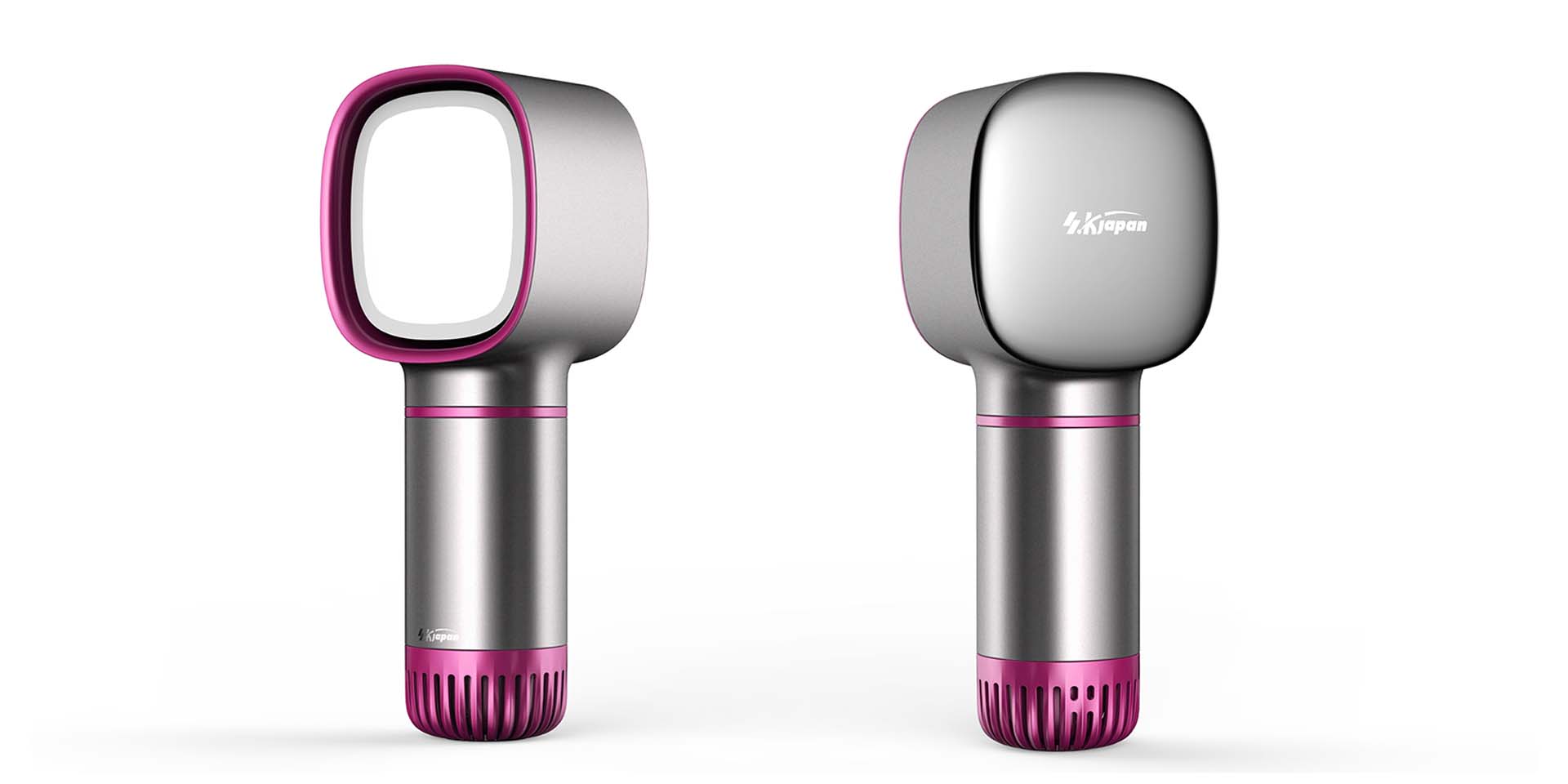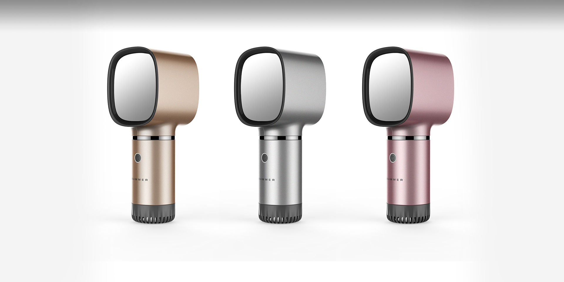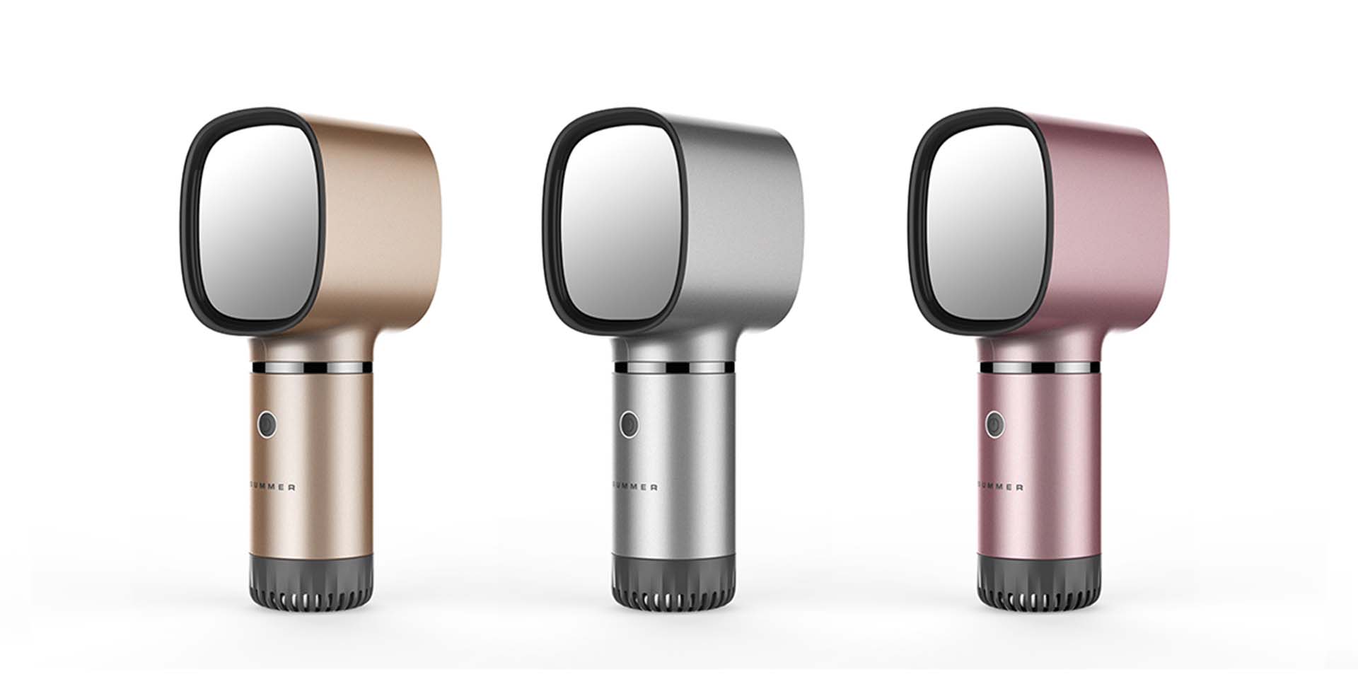 此款無葉風(fēng)扇為女性群體打造,將補光燈和鏡面相結(jié)合,便于女性在化妝時使用,無須再單獨使用補燈光,同時還可以享受涼爽的感覺。按鍵采用按壓一鍵式,短按風(fēng)量,長按補光,增加了光效功能。設(shè)計師將紋理與進風(fēng)口相結(jié)合,隱藏式設(shè)計,減少進風(fēng)口對整體造型的影響。