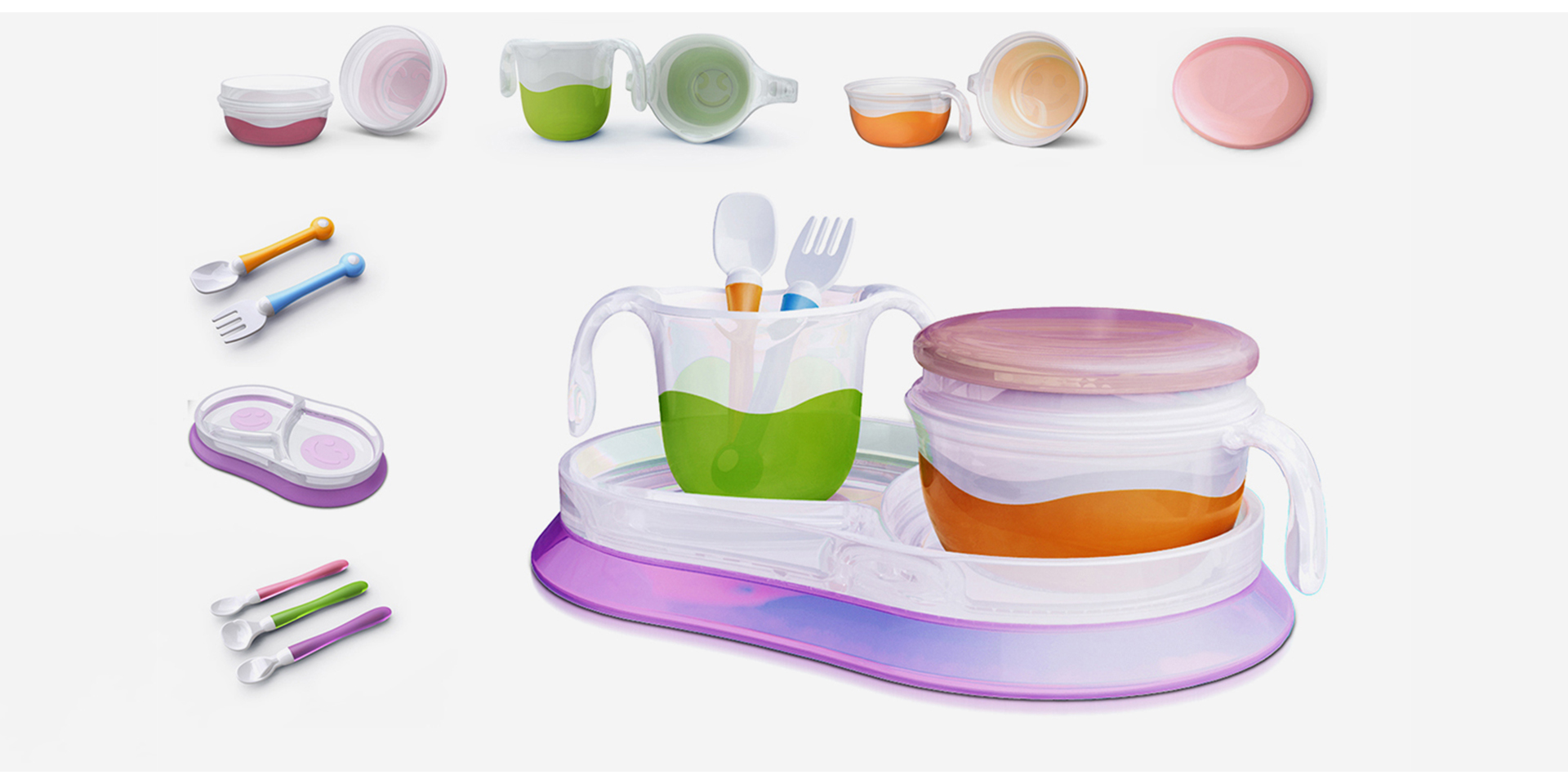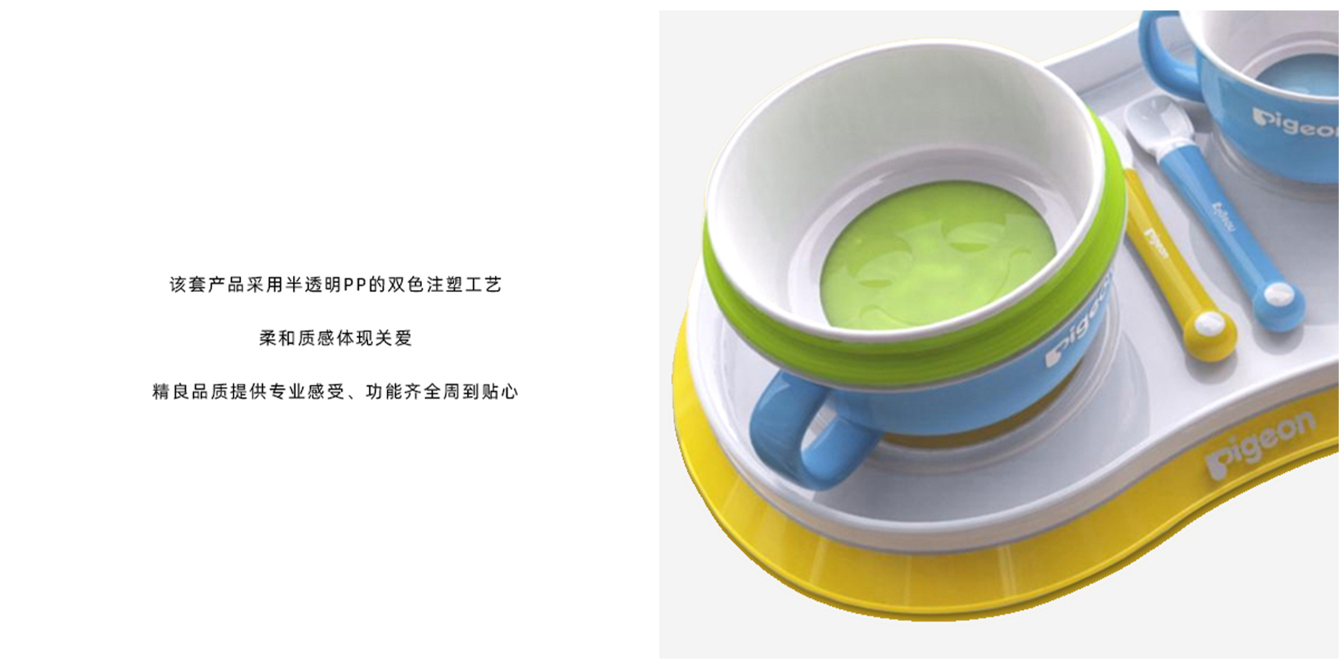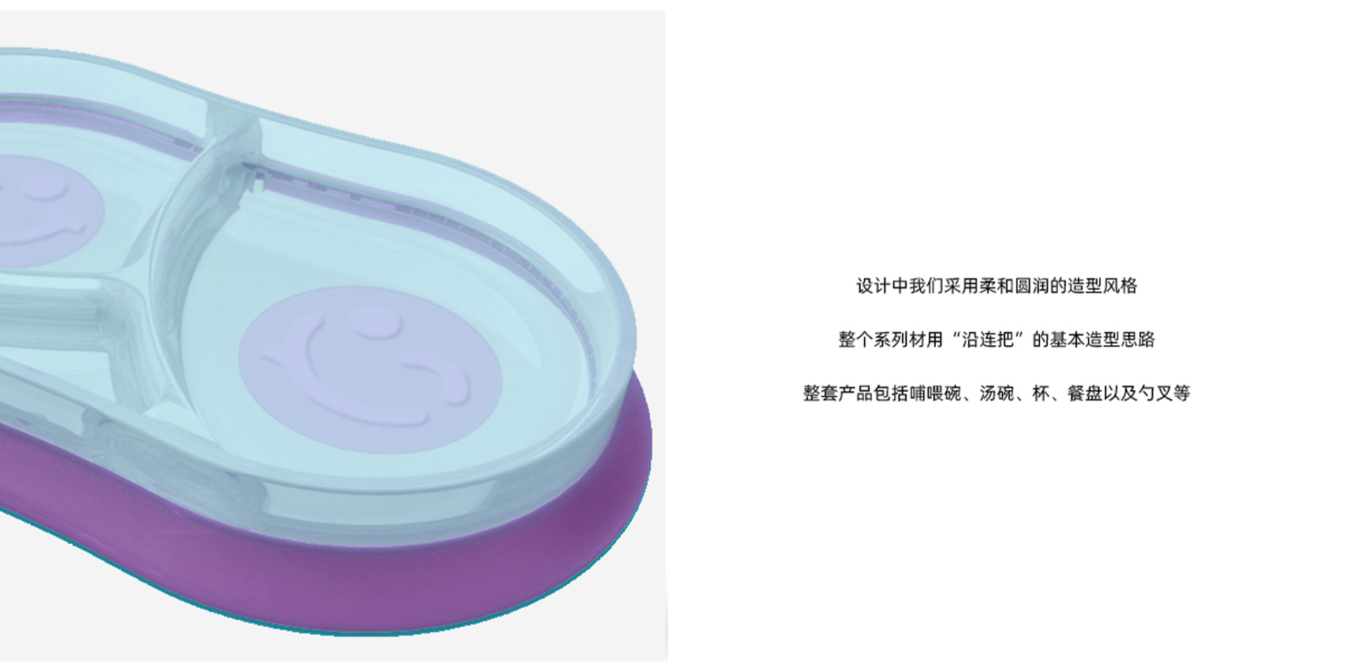 本套產(chǎn)品涵蓋了從12個月的嬰兒到10歲幼兒在進食中所涉及的各種習慣和心理需求變化,其中包括哺喂碗、湯碗、杯、餐盤以及勺叉。該套產(chǎn)品采用半透明PP的雙色注塑工藝,柔和質感體現(xiàn)關愛,精良品質提供專業(yè)感受、功能齊全周到貼心,把對孩子的關愛傳遞到千家萬戶。設計中我們采用柔和圓潤的造型風格,在充分調研了廣大消費者的現(xiàn)實需求后,整個系列材用“沿連把”的基本造型思路,并配合微妙的嬰兒口唇發(fā)育特點,對飲口及勺頭仔細推敲,同時結合圖案色彩激發(fā)孩子的好奇和歡喜心理。最終滿足從母親哺喂嬰兒輔食,到嬰兒自主習慣使用與成人相同的餐具這一學習適應過程的種種人機工程,最終鼓勵幫助孩子學會自己獨立地使用餐具。