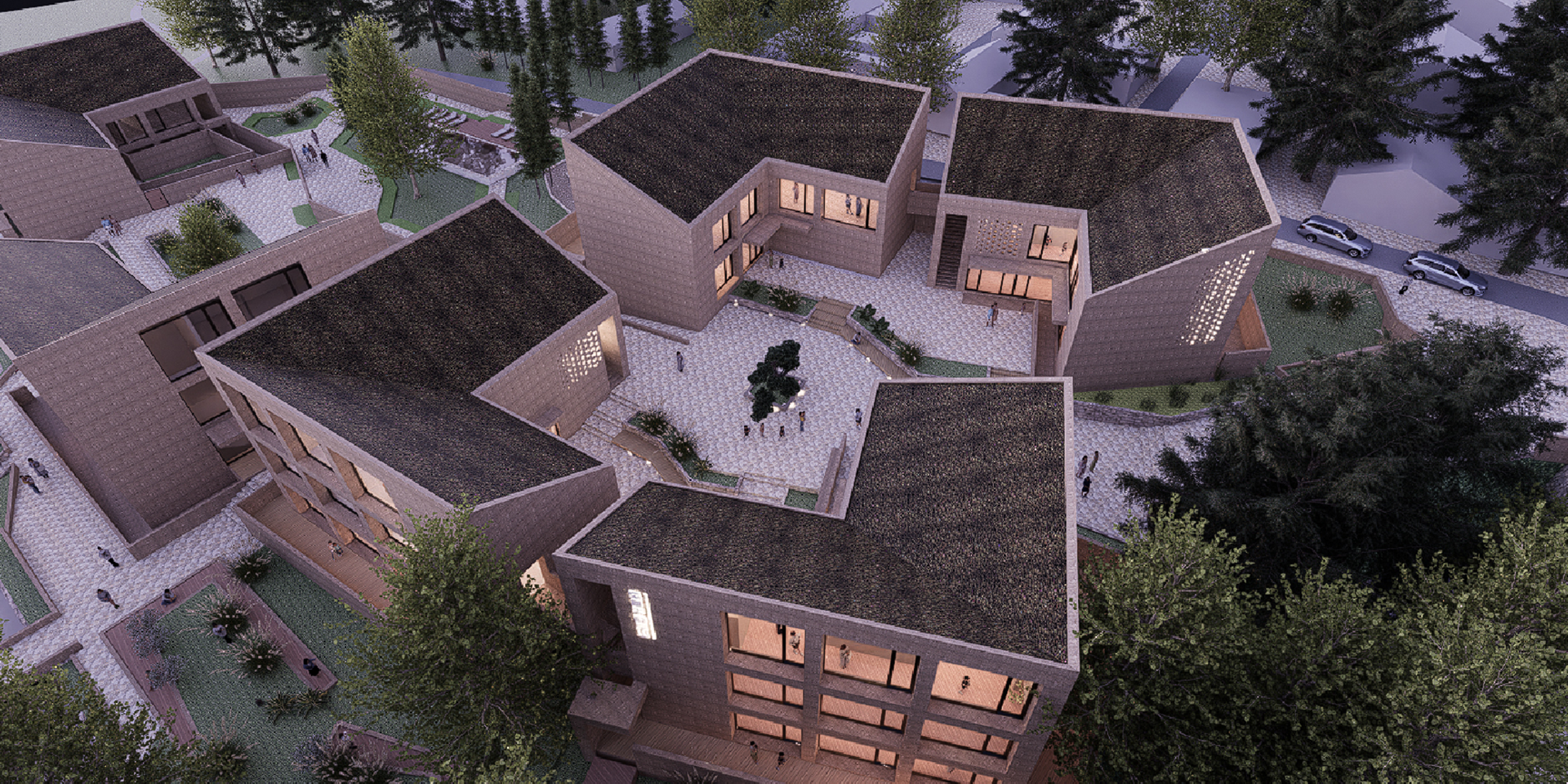 潘家溝村位于羅村鎮(zhèn)北部,面積1724平方千米,155戶約630人,其中傳統(tǒng)農(nóng)業(yè)、干果經(jīng)濟(jì)林、養(yǎng)殖業(yè)、勞務(wù)輸出是農(nóng)民增收的主導(dǎo)產(chǎn)業(yè),通過生態(tài)農(nóng)業(yè)體驗(yàn)等途徑可為村莊帶來生態(tài)價(jià)值和產(chǎn)業(yè)價(jià)值。設(shè)計(jì)源于蘭陵獨(dú)特的傳統(tǒng)聚落形態(tài),并尊重自然地貌。建筑沿著場地高差建造,**限度保留現(xiàn)存林木。設(shè)計(jì)尊重自然坡地、現(xiàn)狀林木水體、村落肌理,并通過院落空間、坡頂形態(tài)、建筑材料實(shí)現(xiàn)在地建筑。