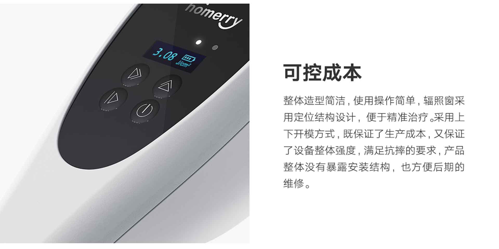 希格瑪SQ1手持光療儀,通過設(shè)計使其體積更加小巧,減輕了重量,符合人機工學(xué)抓握手感,單手可以輕松掌握,便于攜帶和收納,使醫(yī)療產(chǎn)品可以隨時隨地利用空閑時間進(jìn)行使用。以流暢曲線與黃金比例分割,使它更符合時下消費者的審美需求;把手處流線型設(shè)計,把握視覺整體體感,不失平衡,給人舒適的抓握欲望;整體造型與配色,很好的延續(xù)了希格瑪家族產(chǎn)品特性,更顯系列化。白色細(xì)磨砂機身與黑色光亮覆膜的顯示操控區(qū)域,形成視覺對比,使產(chǎn)品更具科技感;整體造型與配色,很好的延續(xù)了希格瑪家族產(chǎn)品特性,更顯系列化。產(chǎn)品采用上下開模方式,既保證了生產(chǎn)成本,又保證了設(shè)備整體強度,滿足抗摔的要求,產(chǎn)品整體沒有暴露安裝結(jié)構(gòu),也方便后期的維修。