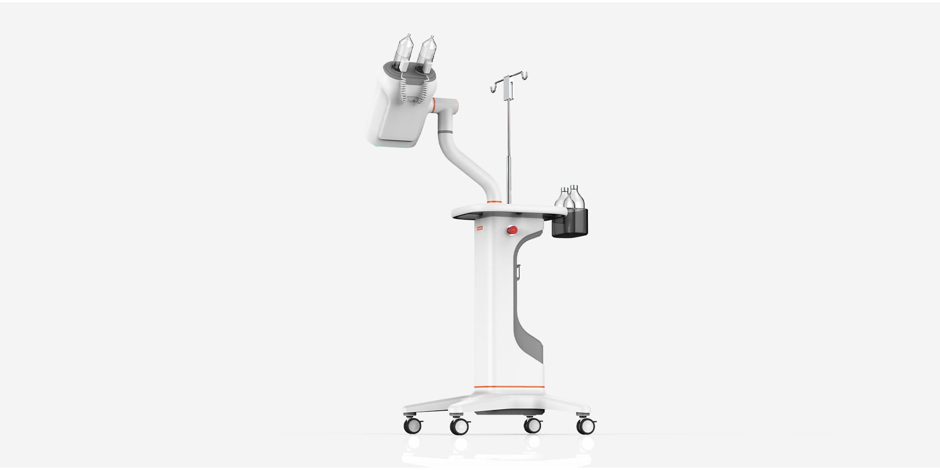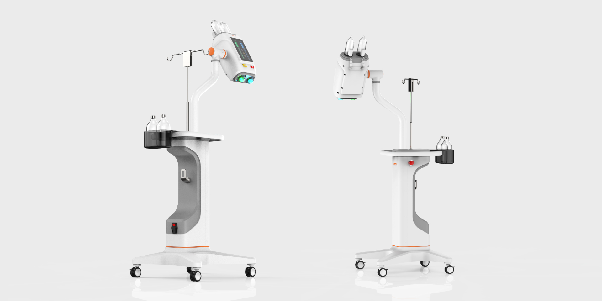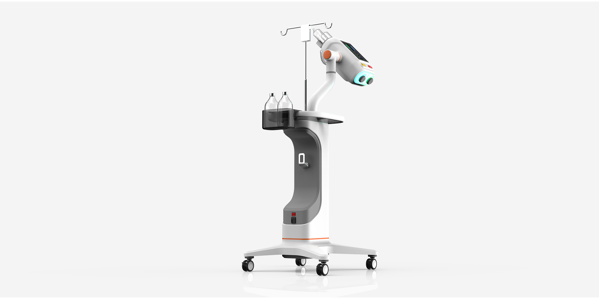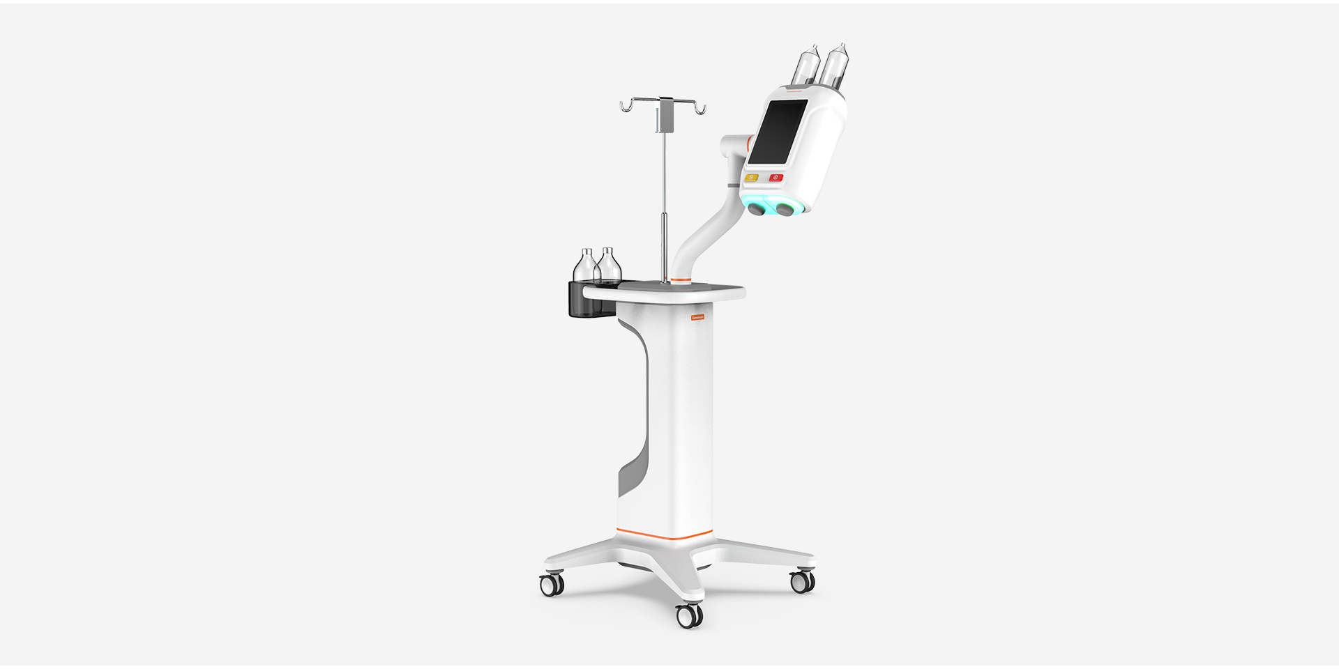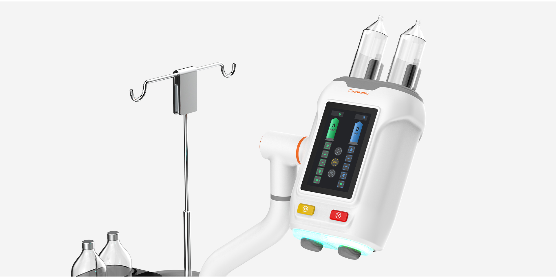 該高壓注射器整體造型采用簡(jiǎn)約幾何,符合當(dāng)下醫(yī)療造型趨勢(shì)。高壓注射器適用于CT室內(nèi)各種增強(qiáng)造影,其采用雙筒設(shè)計(jì),可同時(shí)注射對(duì)比劑與生理鹽水,相比傳統(tǒng)單筒高壓注射器,可以更有效節(jié)約對(duì)比劑,減輕患者體內(nèi)代謝負(fù)荷;自動(dòng)吸藥,降低操作難度,節(jié)約準(zhǔn)備時(shí)間,大大提高技師及護(hù)士的工作效率。Wave高壓注射器的雙流注射功能可以提供差異化顯影、減少對(duì)比劑偽影,便于醫(yī)生精準(zhǔn)診斷。在安全性上,Wave高壓注射器提供實(shí)時(shí)壓力曲線(xiàn),監(jiān)測(cè)壓力變化,減少滲漏、降低患者風(fēng)險(xiǎn);并有兩級(jí)超壓報(bào)警,當(dāng)接近設(shè)定的壓力閾值時(shí),會(huì)進(jìn)行預(yù)警,超過(guò)壓力限制會(huì)有聲光報(bào)警并停止注射程序,保證患者注射安全。